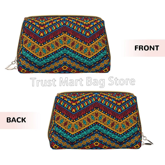 Boho African Tribal Geometric Leather Makeup Bag – Large-Capacity Travel Pouch for Women