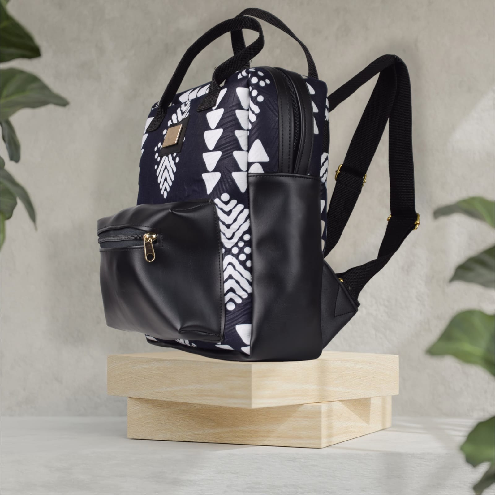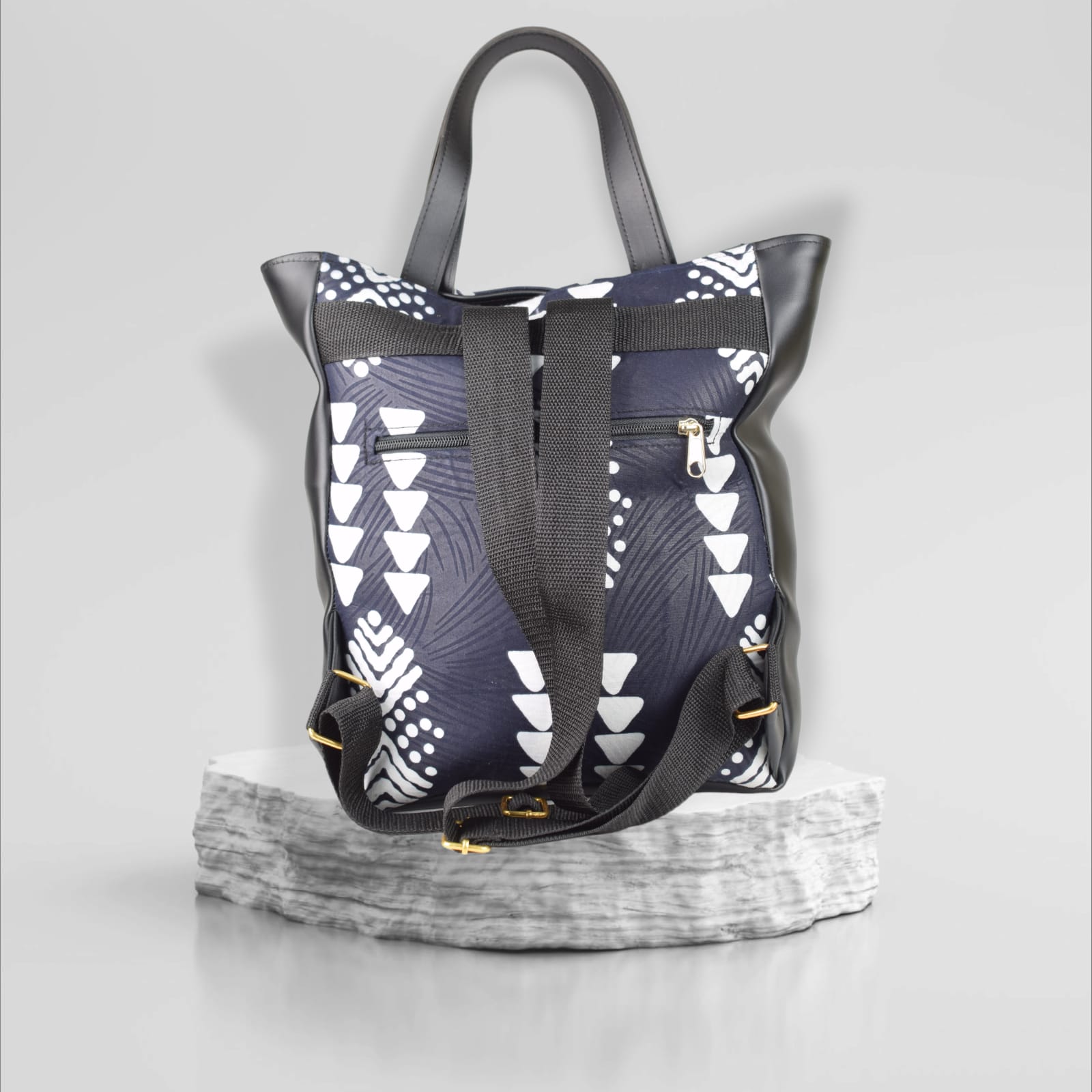 The backpack impresses with its unique design, decorated with a striking blue and white tribal pattern. This pattern, inspired by traditional ethnic patterns, gives the backpack not only a modern but also a cultural touch. The harmonious combination of blue and white colors makes the backpack stand out both in nature and in urban environments and can be easily combined with different outfits.